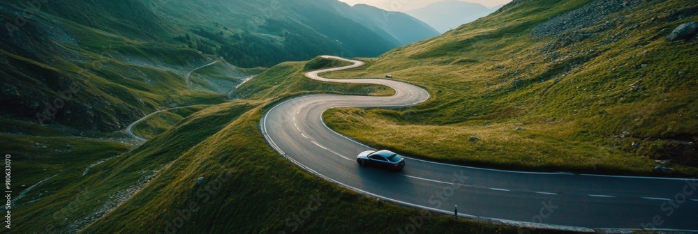 Obraz Pojazdy - Aerial view of car and winding road in high mountain pass. Serpentine curvy road #980633070