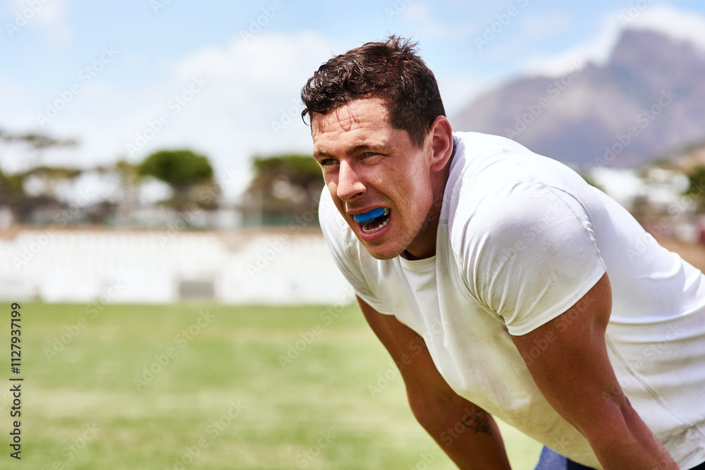 Obraz Sport - Man, rugby and tired on match at field with sweat for sports game, tournament and competition in... #1127937199