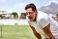 • Man, rugby and tired on match at field with sweat for sports game, tournament and competition in New Zealand. Male person, stadium and exhausted as player or athlete on half time with workout