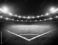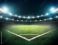 • textured soccer game field with neon fog - center, midfield. Empty soccer stadium with spotlight and fan tribune football team. Concept of live sport events,