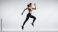 • Dynamic athletic woman mid-sprint, showcasing strength and fitness in a studio setting. Poised for speed and agility training. Motivation & Drive.