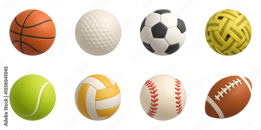 • 3D render collection of various sports balls including basketball football soccer and tennis