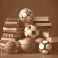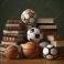 • The harmonious blend of classic books and sports balls suggests a metaphor for the integration of knowledge and physical activity. An intriguing visual concept.