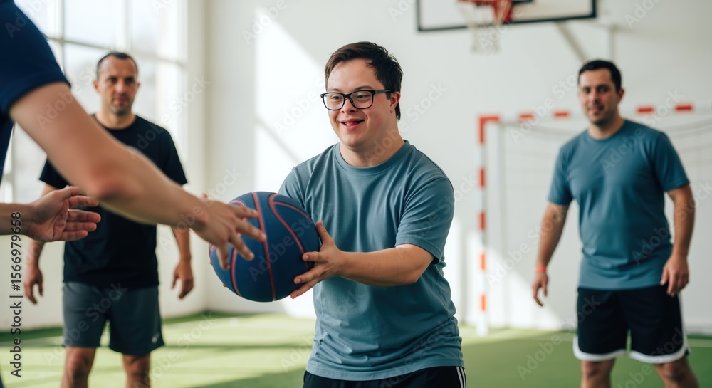 • Young man down syndrome playing basketball gym with teammates inclusive sports program. Special needs athlete participating team activities fitness training. Disability inclusion concept banner