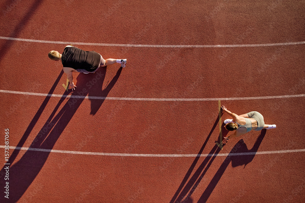Obraz Sport - Two athletes in starting position on running track, aerial view #1573087065