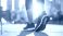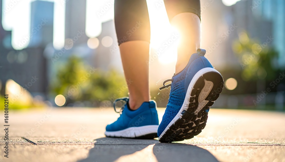 Obraz Sport - Low-angle close-up of runner's feet in blue athletic shoes on city path, sunlit #1610802141