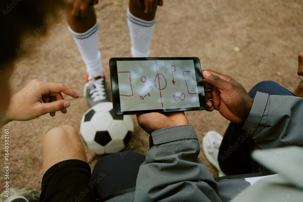 Obraz Sport - Caucasian teenager and Black man analyzing soccer strategy on digital tablet outdoors, soccer... #1648382161