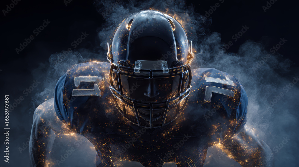 • American football player helmet uniform intense smoke glowing dark background action strength energy determination. powerful athlete glowing