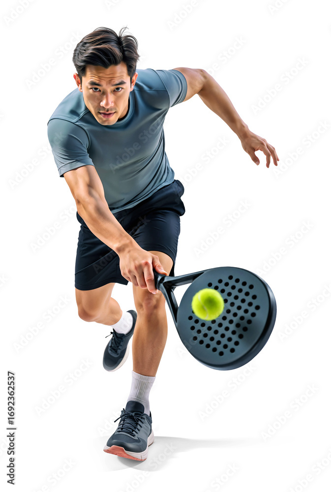 • Determined asian male padel player leaning forward to return the ball on isolated background