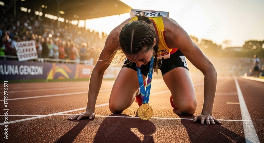 • Victorious female athlete emotional after winning gold medal. Champion runner kneeling on track at sunset. Concept of success, determination, achievement, and sports competition.