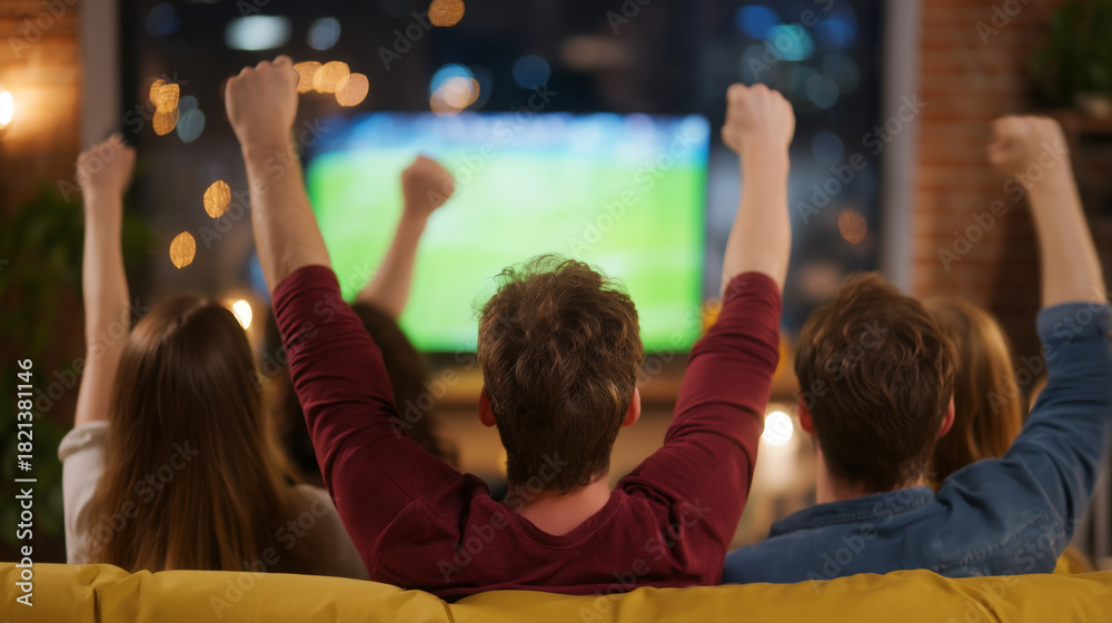 Obraz Sport - Friends cheering watching sports on TV at home #1821381146