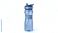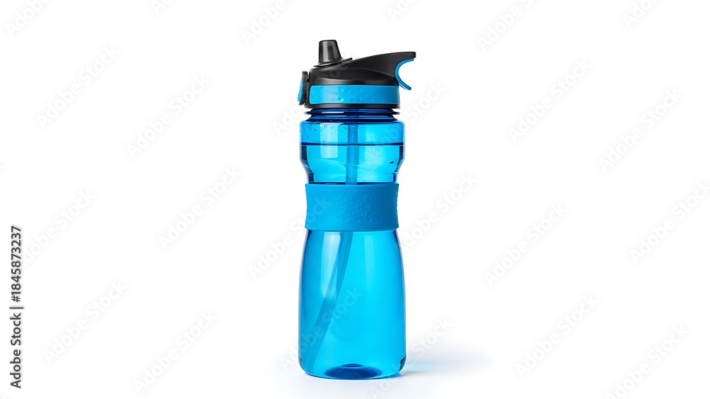 • Blue plastic sports water bottle with black lid and handle on white background