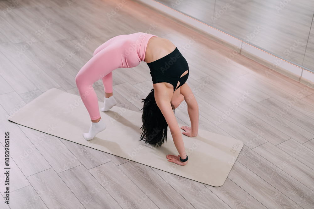 Obraz Sport - A young athletic woman practices an advanced yoga backbend pose in a bright fitness studio,... #1893905105