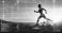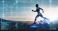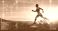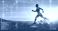 • Hologram, athlete and running for wellness, exercise for healthy lifestyle and track heart rate. Male, futuristic and runner with digital sports, double exposure for marathon and fitness training.