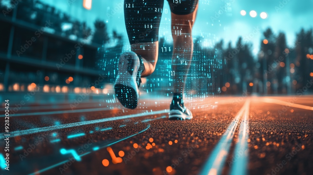 Obraz Sport - Athlete wearing a high-tech fitness tracker while running on a track, digital stats floating... #928200424