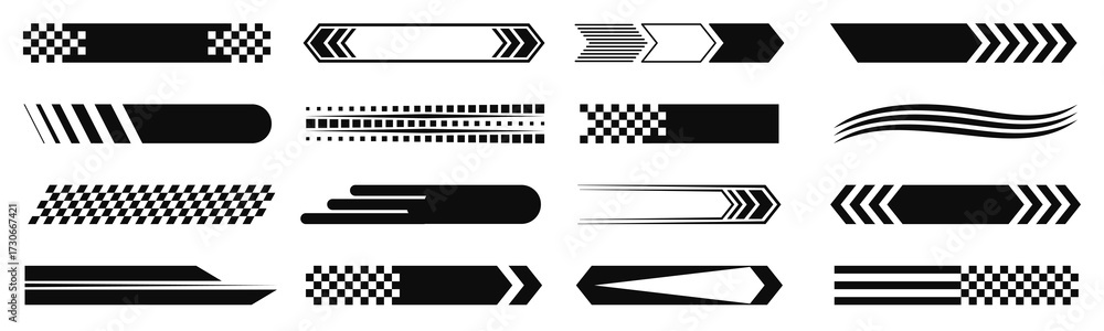 • Racing cars and race car stripes set. Checkered flag, start and finish line, motocross labels, dynamic lines, motorsport, racing stripe speed, sport decals, tuning stickers, speed motion elements
