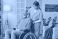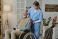 • Caucasian senior man with disability sitting in wheelchair being assisted by young adult Hispanic woman caregiver while elderly Caucasian woman reading book in background