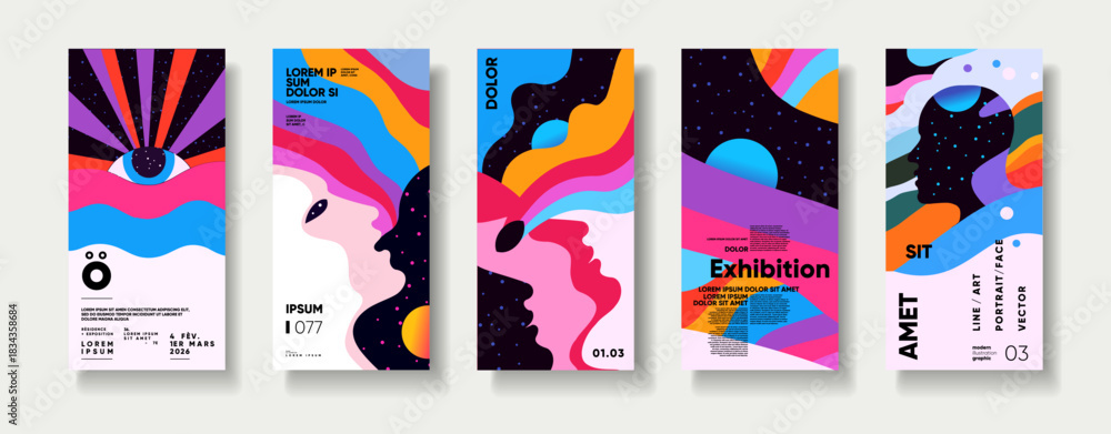 • A vibrant set of abstract posters featuring colorful, flowing designs with cosmic elements. Each poster showcases unique artistic styles, blending bold colors and shapes