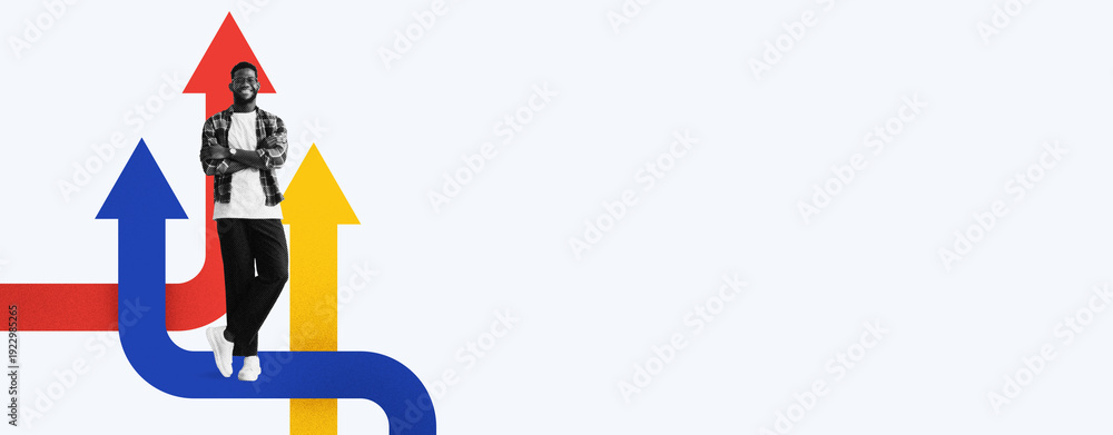 • A person stands confidently in a collage with colored arrows pointing in various directions. The setting looks simple and modern. The arrows are red, blue, and yellow.