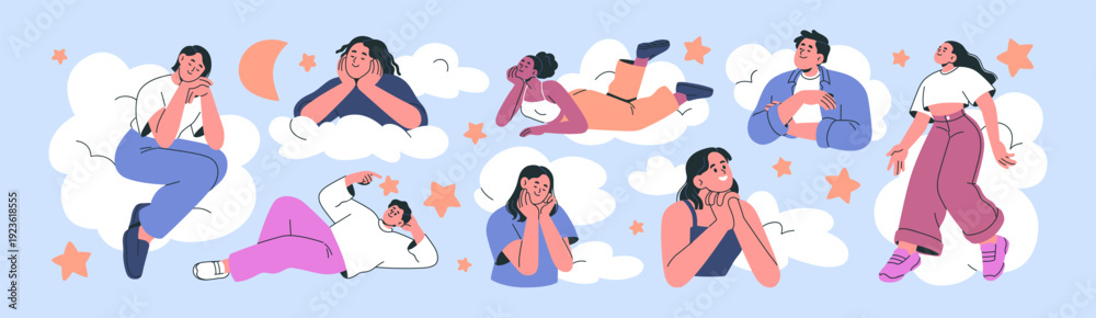 • Dreaming hopeful smiling people floating in sky clouds. Men and women dreamers with hopes, thoughts, ideas. Happy dreamy characters dream, imagine, making wish, daydreaming. Flat vector illustration
