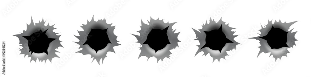 • Bullet hole gun mark effects set. Dark impact shapes with torn edges and metallic shading on white background with damage textures. Detailed realistic vector illustration.
