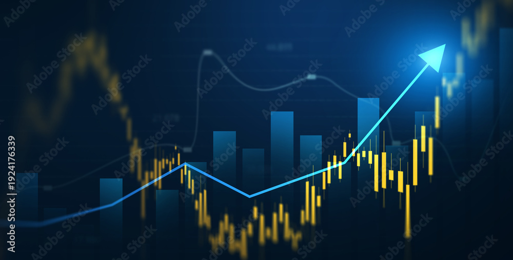 • Financial data charts with glowing stock market graphs.Business financial chart with moving up arrow graph.Stock market investment data and analysis finance graph.