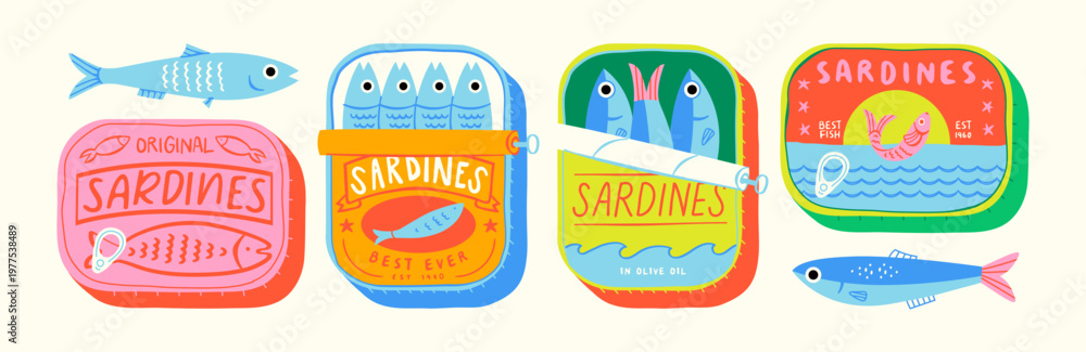Obrazy Fantasy - Funny hand drawn canned fish cartoon illustration set. Colorful tinned sardines sea food graphic... #1977538489