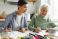 • Alzheimer treatment game at home, old lady with gray hair in glasses and her female home assistant drawing together at kitchen table, using colorful markers. Art therapy for dementia prevention