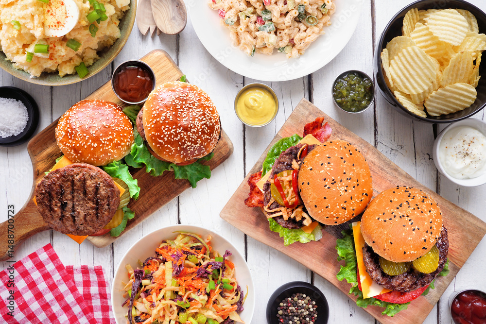 • BBQ table scene with hamburgers, classic salads and snacks. Top down view over a white wood background.