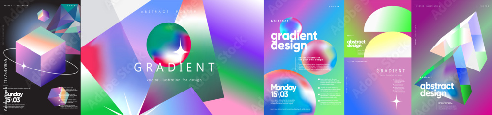 Vibrant abstract gradient backgrounds set. Futuristic 3D shapes, spheres, art, cube, and prisms with neon colors, holographic light, and modern minimal design for poster, cover, and web design.