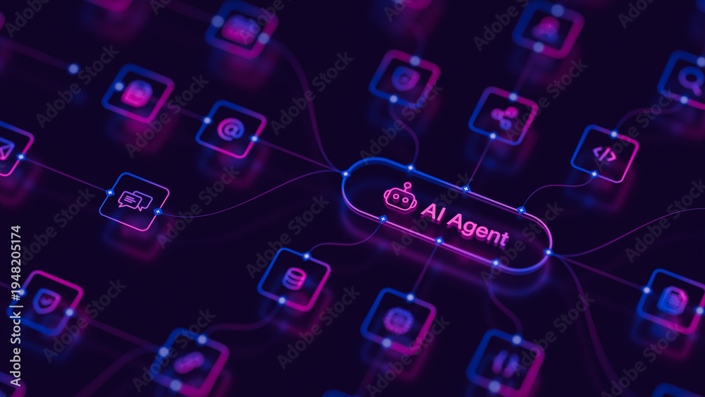 • AI agentic workflow automation artificial intelligence agent software interface nodes triggers data tool dashboard coding icon flow process database technology 3d rendering.