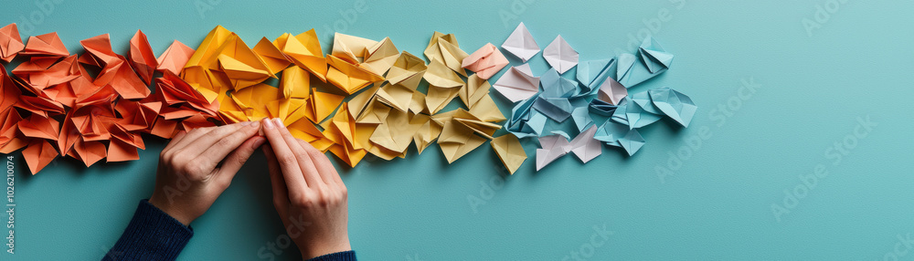 Obrazy Origami - Hands creating paper origami on a colorful background. #1026210074