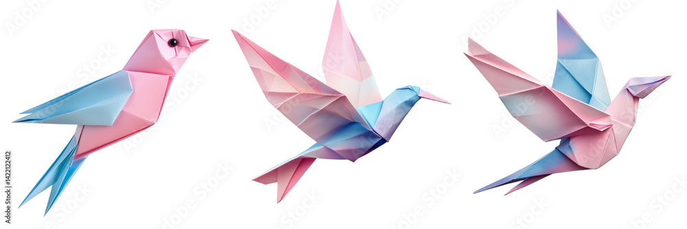 • A set of delicate handcrafted paper origami birds in soft colors, isolated on a transparent background