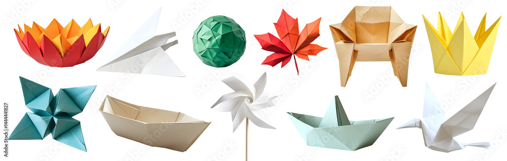 • Collection set of origami paper fold of colourful paper, crane bird, plane, ball, chair, crown, boat, leaf, finger pointer, flower on transparent cutout PNG. Many classic pattern. Mockup template
