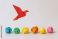 • Colorful paper origami bird and crumpled paper balls on a plain background.