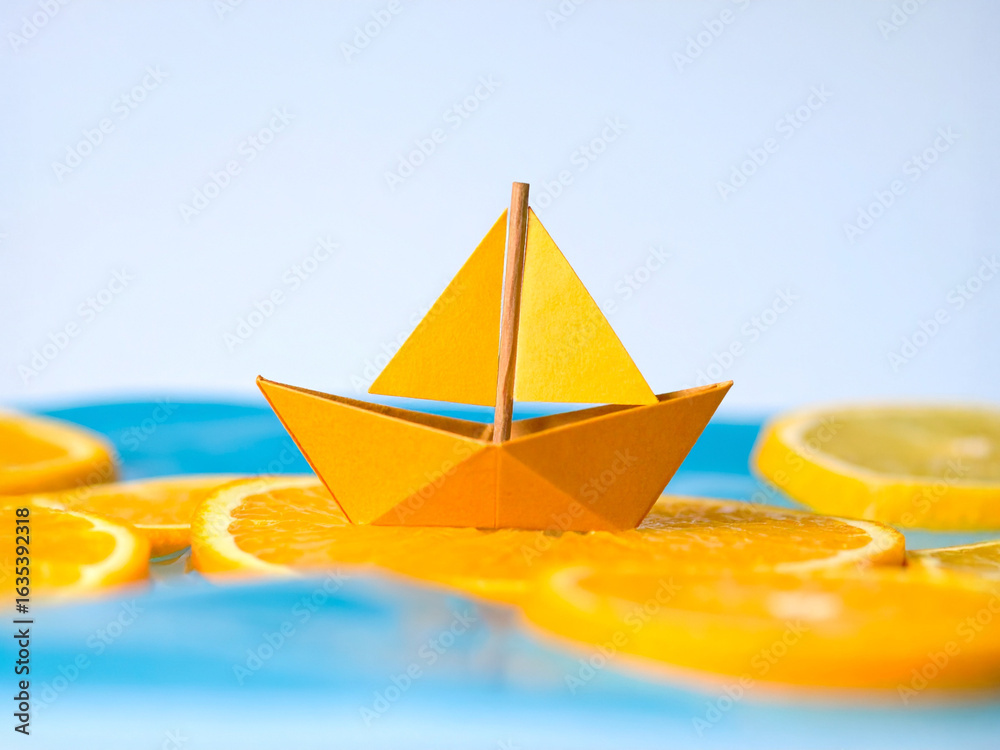 • A creative and whimsical image of a yellow origami paper boat floating on a vibrant "sea" of fresh orange slices. The scene is a metaphor for a fresh start, a healthy journey, or summer adventures.