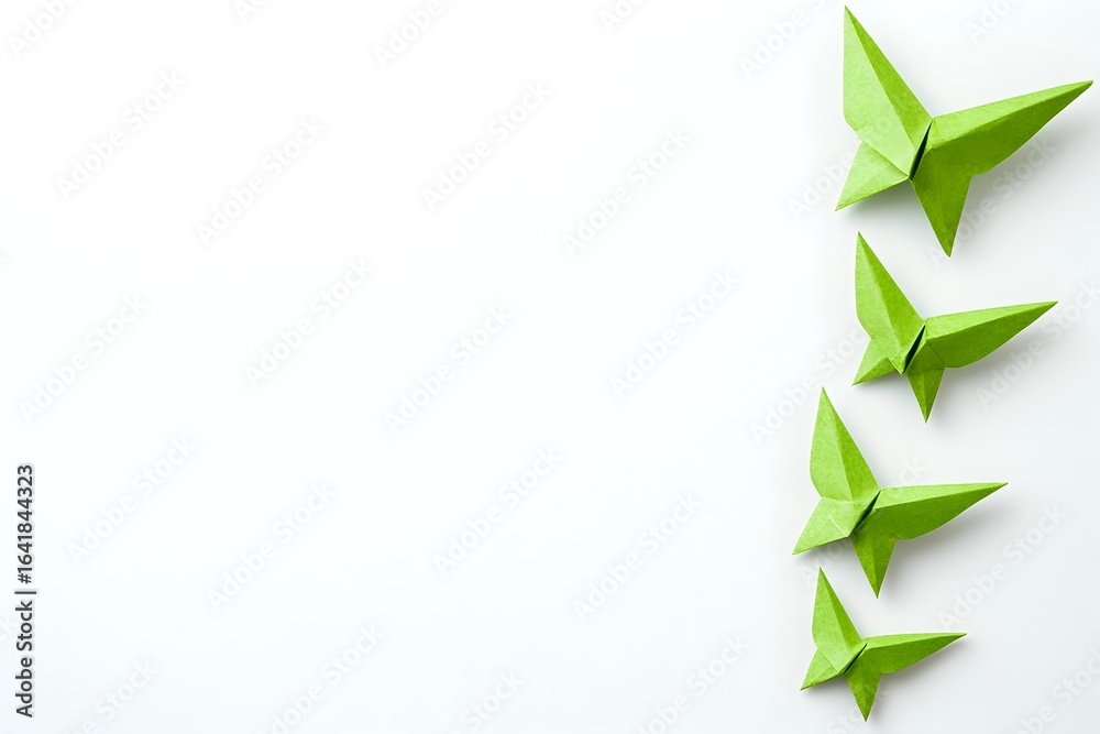 • Green origami butterflies arranged in diagonal line on white background, minimalist paper art design for creative projects and decorative elements.