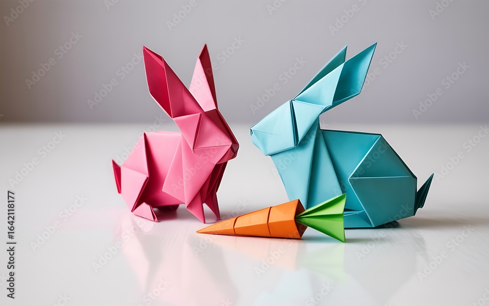 Obrazy Origami - Two origami rabbits with a carrot on a white surface #1642118177