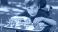 • A young boy in a wheelchair happily engages in origami, creating colorful paper cranes on a tray.