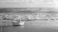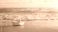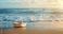 • A paper boat on a sandy beach with a sea background, with beige and blue tones.
