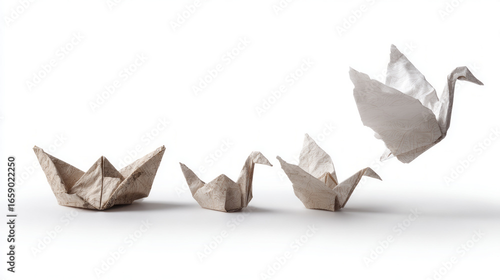 • Crumpled paper transforms into an elegant origami swan, symbolizing creative metamorphosis