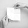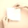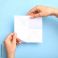 • Hands meticulously fold a sheet of white paper, creating a simple origami design against a light blue background.