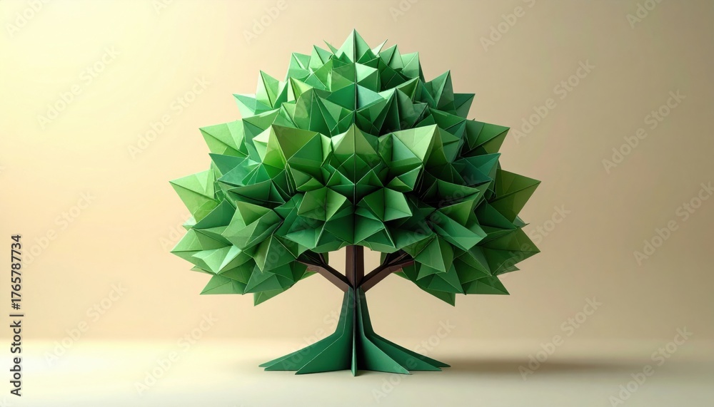 • Stunning green origami tree symbolizing growth, nature, and eco-friendly concepts in a clean studio setting