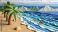 • Paper craft beach scene with palm trees origami crabs and layered ocean waves