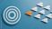 • Leadership concept with an orange paper airplane leading a group of white planes towards a target symbolizing innovation strategy and achieving goals on a blue background focus and determination