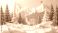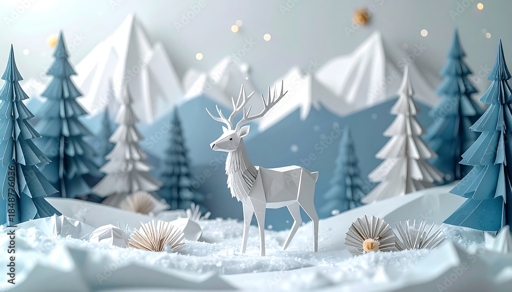 • Stylized winter scene with white paper deer amidst snow, trees, and mountains, illuminated by soft bokeh lights