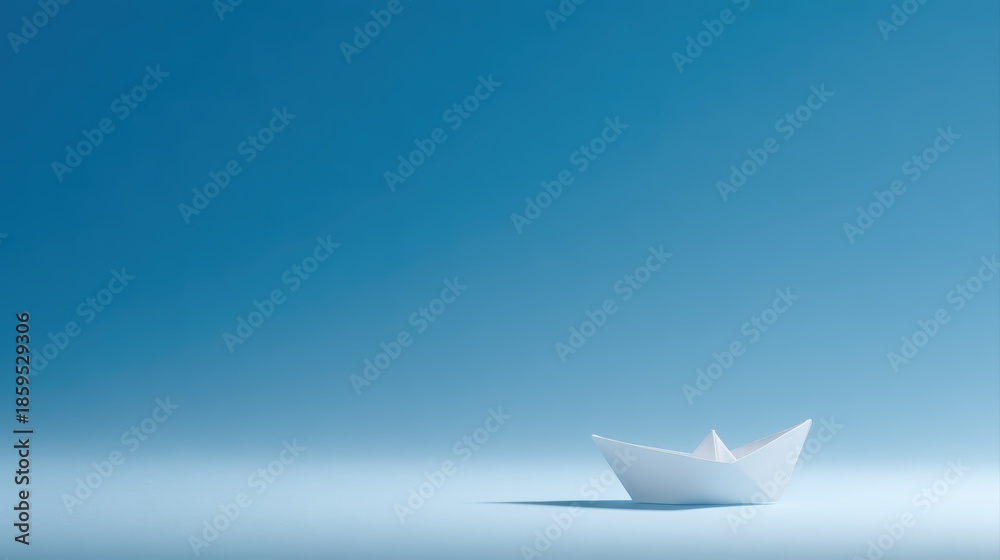 • paper origami boat in vast blue sky, freedom ambition and imagination theme, airy minimal composition