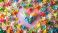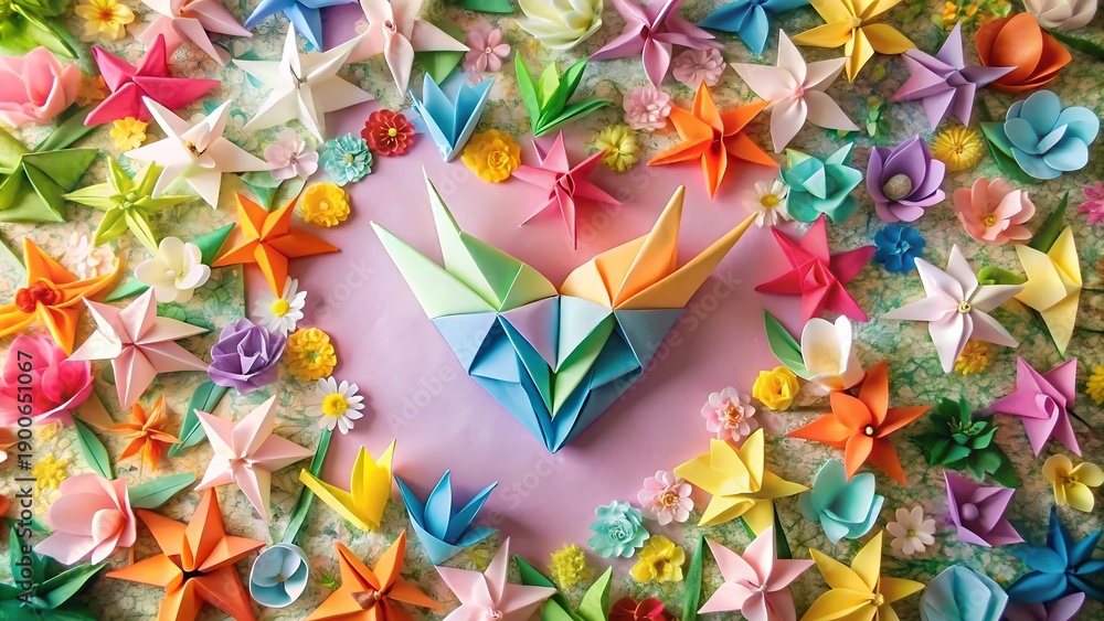 • A colorful origami heart surrounded by vibrant flowers and paper cranes