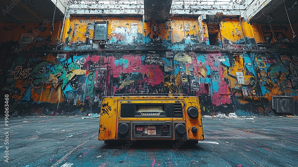 • Boombox and classic music cassette player against a dark background. Retro hip-hop culture. Colorful graffiti wall with urban street art. Concept with a vintage boom box in front of a colorful wall
