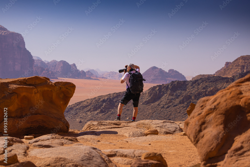 Obrazy Kamień - Wadi Rum w Jordanii. Mężczyzna stojący na skale fotografujący pustynię. #593382672